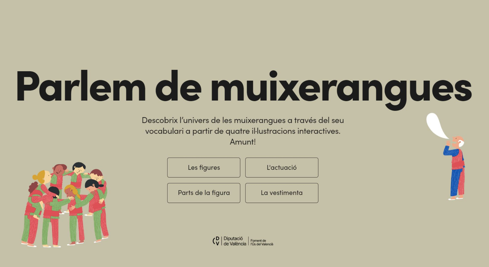 En el web https://parlemdemuixerangues.dival.es/, que té com a objectiu oferir una aproximació didàctica a esta tradició, la Diputació de València ens descobrix l’univers de les muixerangues a través del seu vocabulari amb quatre il·lustracions interactives. A més, permet descarregar les imatges en màxima definició per a imprimir-les o compartir-les, col·laborant en la difusió i visibilització d’este espectacle. «Parlem de muixerangues» ha estat coordinat per Àlex Martínez Orts, amb il·lustracions de Paulapé i disseny del web de Sud+Sud.