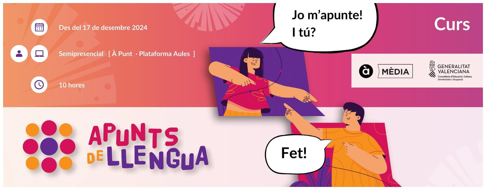 - La jornada consta d’una primera sessió presencial a À Punt de tres hores, on es presentarà la plataforma Apunts de Llengua i es farà una visita guiada a les instal·lacions.