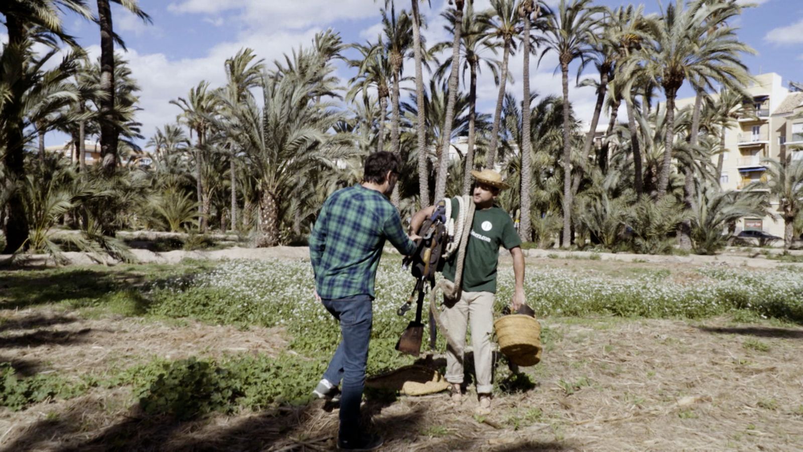 Eugeni Alemany i Miguel Àngel, palmerer, ens parlen de l'ofici del munyidor de dàtils. Ens expliquen de quines coses s'ha d'encarregar un palmerer i quines són les principals eines de treball en este ofici.