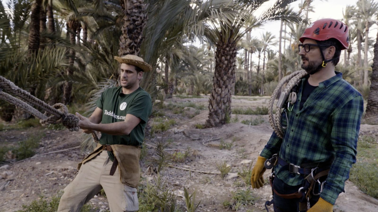 Eugeni Alemany xarra amb un palmerer que li ensenya les eines tradicionals que utilitzaven per a collir els dàtils i el sistema modern que utilitzen ara, especialment com a mesures de seguretat.